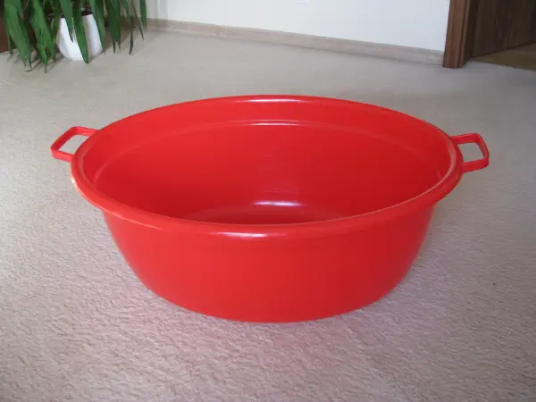 Sprzedam dużą owalną miskę – wanienkę o pojemności 60 litrów w czerwonym kolorze.