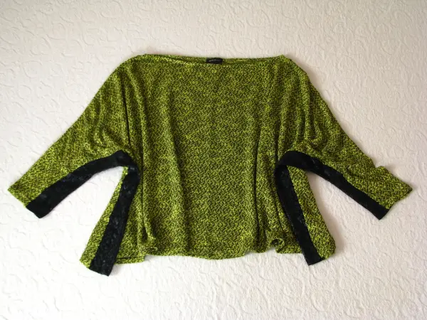 Sweterek zakładany jest przez głowę, wykończenie pod szyją w szeroką „łódkę”, rękawy po założeniu ¾, boczne szwy i wewnętrzna strona rękawa wykończona jest ozdobnym, czarnym materiałem nadającym całości charakteru.