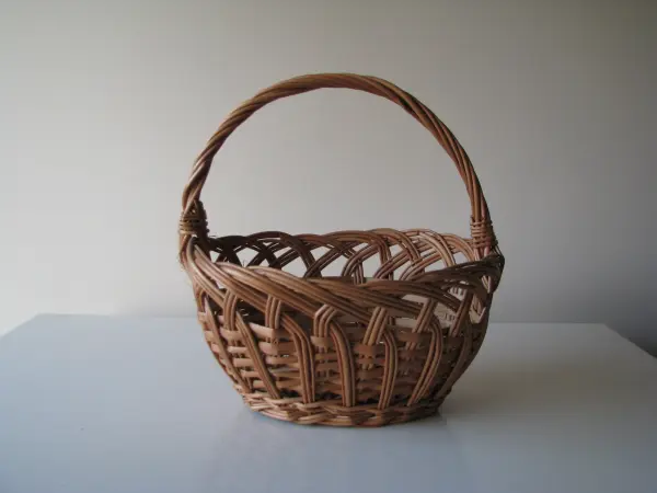 Sprzedam, niewielkich rozmiarów, owalny, ręcznie pleciony koszyk wiklinowy w ciepłych, naturalnych odcieniach, wykończony ładnym, ażurowym splotem.