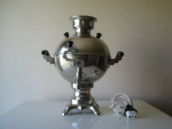 Piękny, stary radziecki samowar o ciekawym, kulistym kształcie posiada klasyczną konstrukcję: składa się ze zbiornika na wodę, wewnątrz którego umieszczona jest grzałka elektryczna.