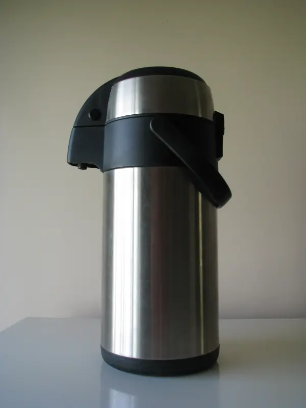 Sprzedam duży termos z pompką o pojemności 3 litrów do serwowania ciepłych i zimnych napojów w kolorze srebrnym z czarnymi akcentami.