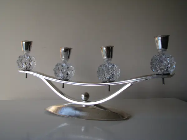 Świecznik w srebrnym kolorze, o wydłużonym kształcie z kryształowymi, karbowanymi kulami, zakończonymi metalowymi uchwytami na świece o średnicy do 2,5 cm.