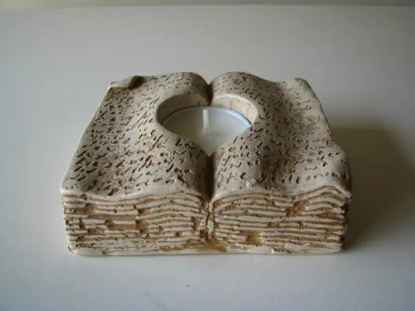 Sprzedam ciekawy świecznik w kształcie starej otwartej księgi z miejscem na świeczkę podgrzewacz tea light. Świecznik kamienno-podobny, dość ciężki w ciepłym, beżowo-brązowym kolorze.