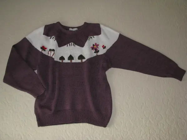 Sweter jest ciepły i miękki w dotyku – nie gryzie i nie gniecie się, wykonany w 64% z bawełny i w 36% z poliakrylu. Posiada bardzo oryginalny, uroczy wzór wykończony ozdobnymi elementami drzewkowo-kwiatowymi, które pozwalają wyróżnić się z gąszczu klasycznych stylizacji. Rękawy i dół sweterka wykończone są ściągaczem, dekolt okrągły.