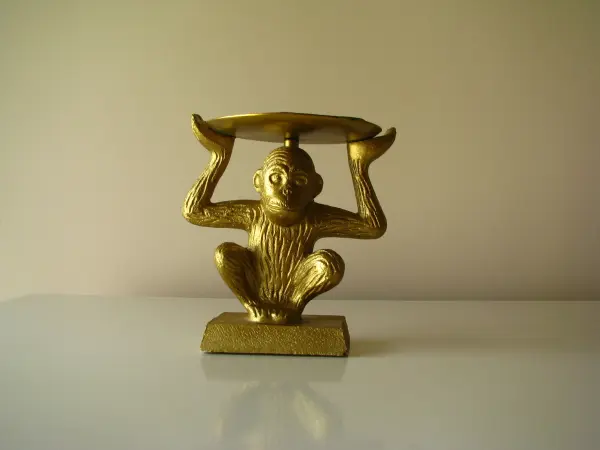 Sprzedam oryginalny świecznik w kształcie małpki trzymającej nad głową podstawę na świecę.