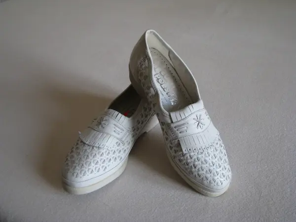 Obuwie posiada równy, niewysoki „obcas”, wsuwane jest na stopę – wygodne w zakładaniu i ściąganiu, w środku miękka wkładka ze skórki naturalnej. Na całości ozdobione ażurowym wzorem a z przodu posiada ozdobną patkę.