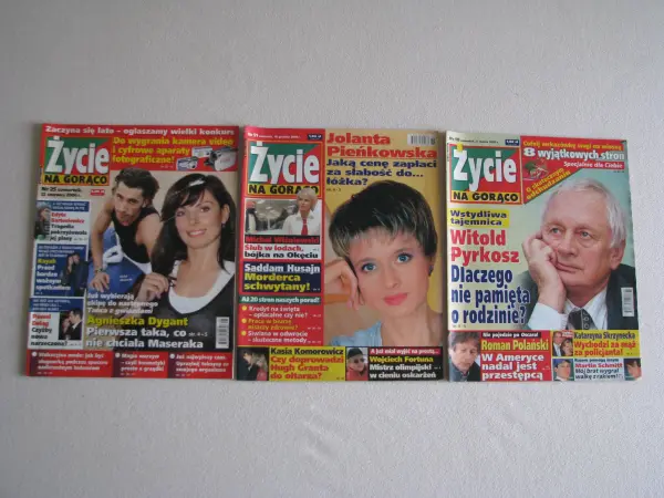 Sprzedam 3 egzemplarze archiwalnych wydań tygodnika Życie na gorąco z lat 2003 i 2006, w formacie 23 x 29 cm, zawierających każde po 49 stron.